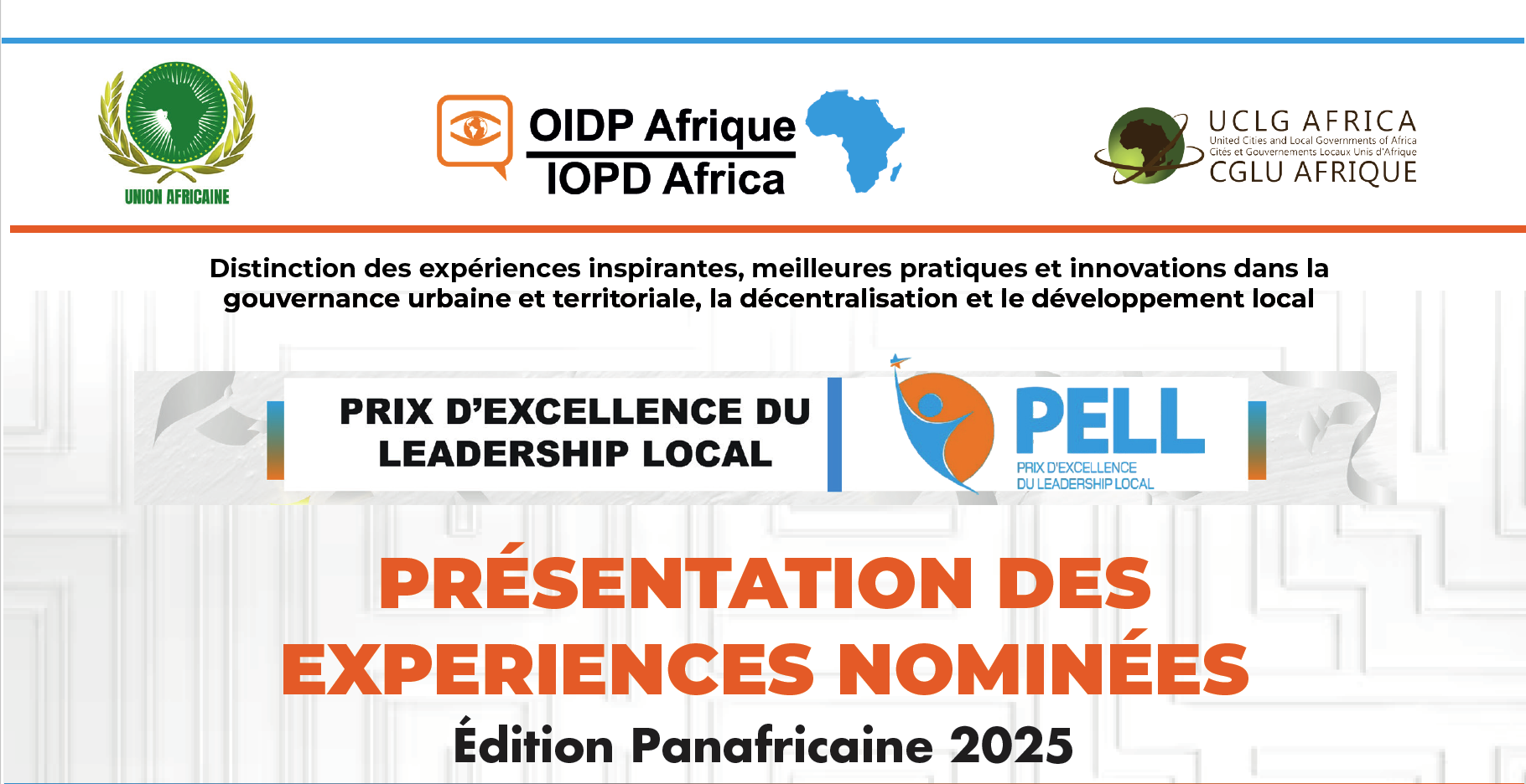 Le Prix d’Excellence du Leadership Local avait déjà connu des éditions organisées aux niveaux national et sous-régional. La présente édition panafricaine, organisée par l’Observatoire international de la Démocratie participative en Afrique, en collaboration avec la Commission de l’Union africaine et Cités et Gouvernements Locaux Unis d’Afrique, vise à récompenser les ministères, les collectivités territoriales, les journalistes et communicants, les universitaires et chercheurs, les enfants et jeunes créateurs, ainsi que les citoyens engagés dans des initiatives innovantes favorisant l’accès aux services publics, la participation citoyenne et la gouvernance inclusive.